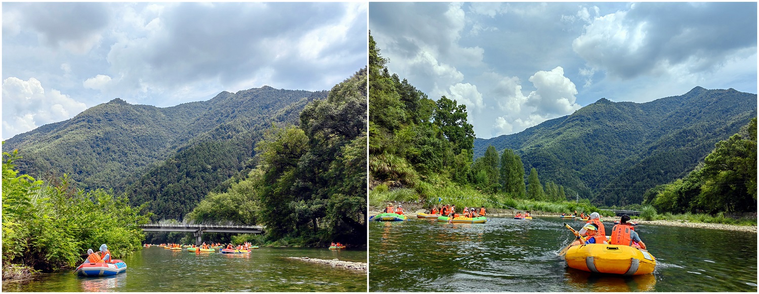 此次行程兩天一夜,在導游的帶領(lǐng)之下,我們首先來到石臺縣大演鄉(xiāng)剡溪村的西黃山漂流景區(qū)。下榻之時,正值正午時分,景點兩岸青山疊嶂、風光旖旎、草木蔥蘢、景色怡人。協(xié)普家人們換好服裝,穿上救生衣,在工作人員的協(xié)助之下,或一家?guī)卓凇⒒蛉搴糜呀Y(jié)伴乘筏而行、泛舟漂流,水面波光瀲滟、河底各式各樣的鵝卵石靜靜地躺著,日復一日被溪水沖刷,變得光滑又圓潤,坐在游筏里俯身去看,“瞧,有不少小魚正悠閑地在它的身上游過呢”,其水之清澈由此可見一斑。此次漂流全程3公里,在漂流過程中,除了欣賞到秀美的湖光山色,體驗到劈波斬浪的沖刺暢快感,更讓人愜意的是,在河灘淺水區(qū)域漂流回緩,協(xié)普家人們正帶著孩子們,在這悠閑的時光里愉快的打起了水仗,孩子們帶上了自己心愛的水槍玩起了水槍大戰(zhàn),有人帶來了水盆和水瓢,于是乎水槍大戰(zhàn)現(xiàn)場演變成了潑水節(jié),歡笑聲、尖叫聲蕩漾在山谷之間,在這愜意的時光里,平日的壓力和煩擾仿佛已煙消云散。