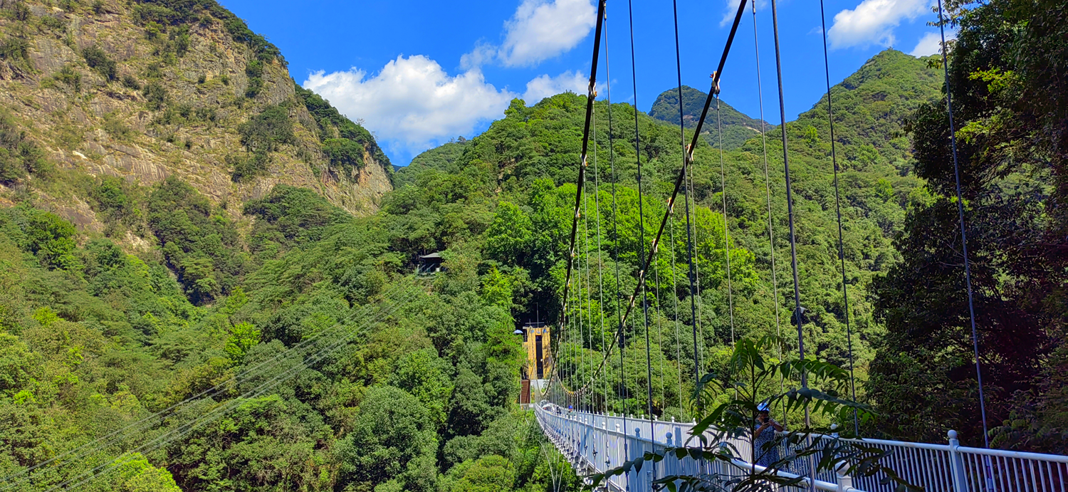 晚上體驗了農(nóng)家樂菜肴和當?shù)靥厣袼藓?,第二天早早的起床,吃完早餐集合,大家興致勃勃地乘著大巴來到了醉山野景區(qū),這里是安徽省內(nèi)第一個5D玻璃橋皖南地區(qū)最大的瀑布群。在進入景區(qū)之前,有一段鄉(xiāng)村道路,徒步的過程頂著早上八九點的太陽就覺得酷暑難耐,然而當我們正式踏入景點,走在山谷間的步棧道上,遠處是蔥郁的山林、近處是流動的溪水、頂上是一片陰涼,只聽見大朋友們小朋友們都在說“好涼快啊,好涼快??!”沿著步棧道繼續(xù)前行,來到了千花橋,這里是著名的網(wǎng)紅打卡點,小朋友們都絡(luò)繹不絕的脫下鞋子、挽起褲腳,下水嬉戲游玩。有合影拍照的、有撿起小石片仍水花的、還有在石頭縫里抓螃蟹的。大家坐在陰涼的石頭塊上休憩閑聊,甚至玩笑起來,富硒山水、天然氧吧,以后老了退隱山林一定要來這里休養(yǎng)生息。有人不被沿途風景耽誤過久,繼續(xù)往山上攀爬,他們到了山頂穿過了玻璃棧橋,體驗了“一覽眾山小”的視野和格局。由于兩個月沒有下雨,雖有山谷溪流卻看不到震撼的黃崖瀑布群,實屬遺憾,卻也給大家下次再來此一游留下了機會。